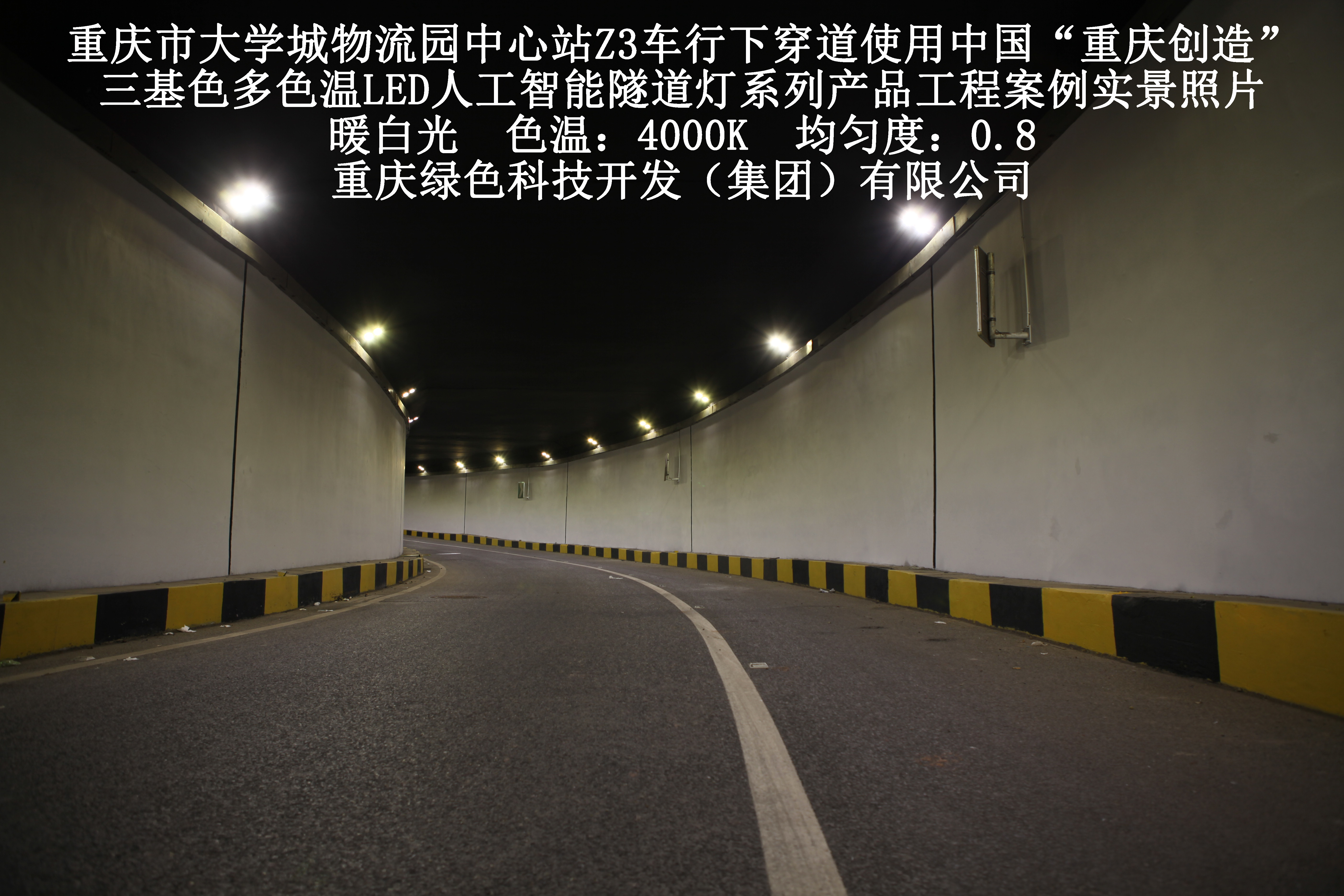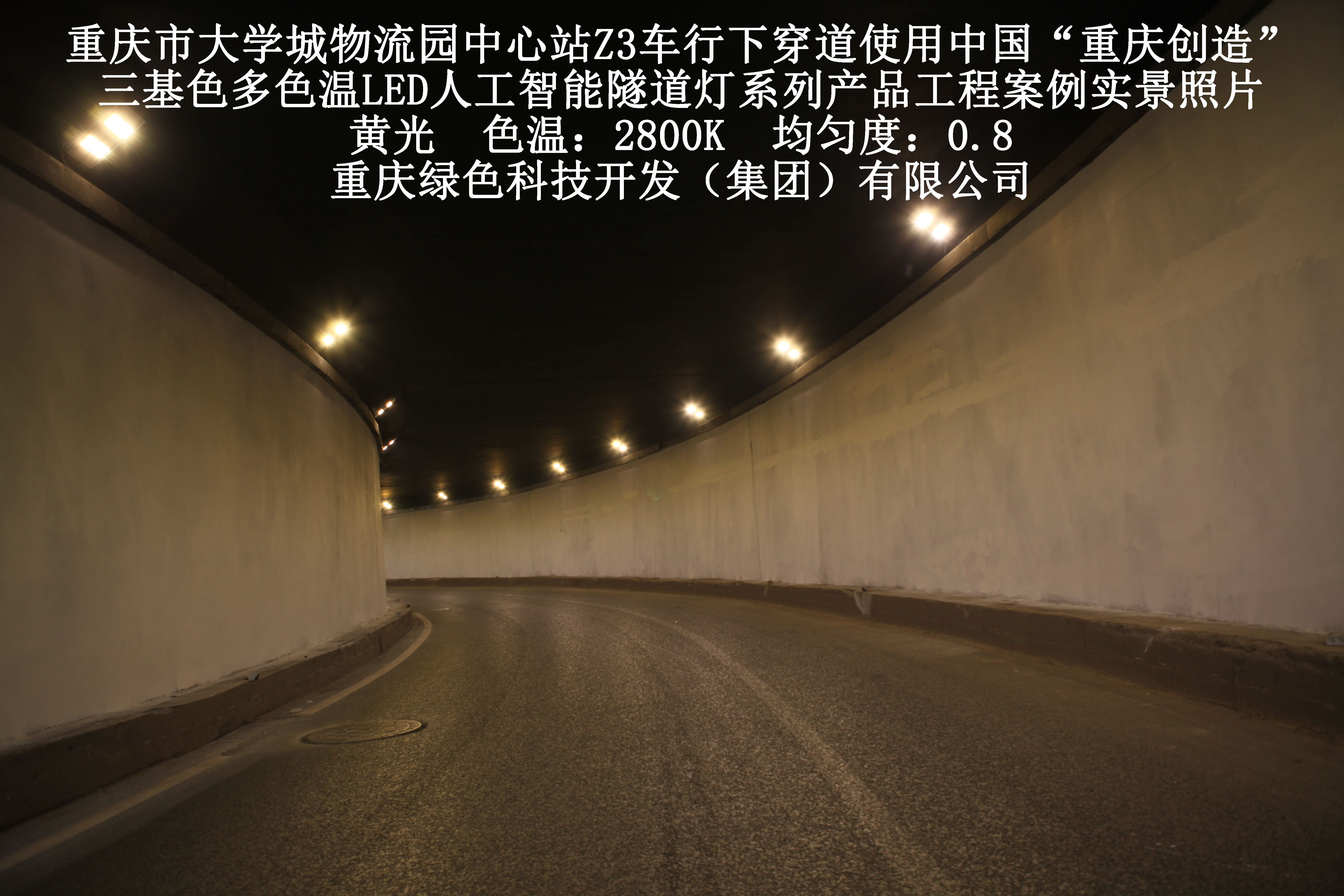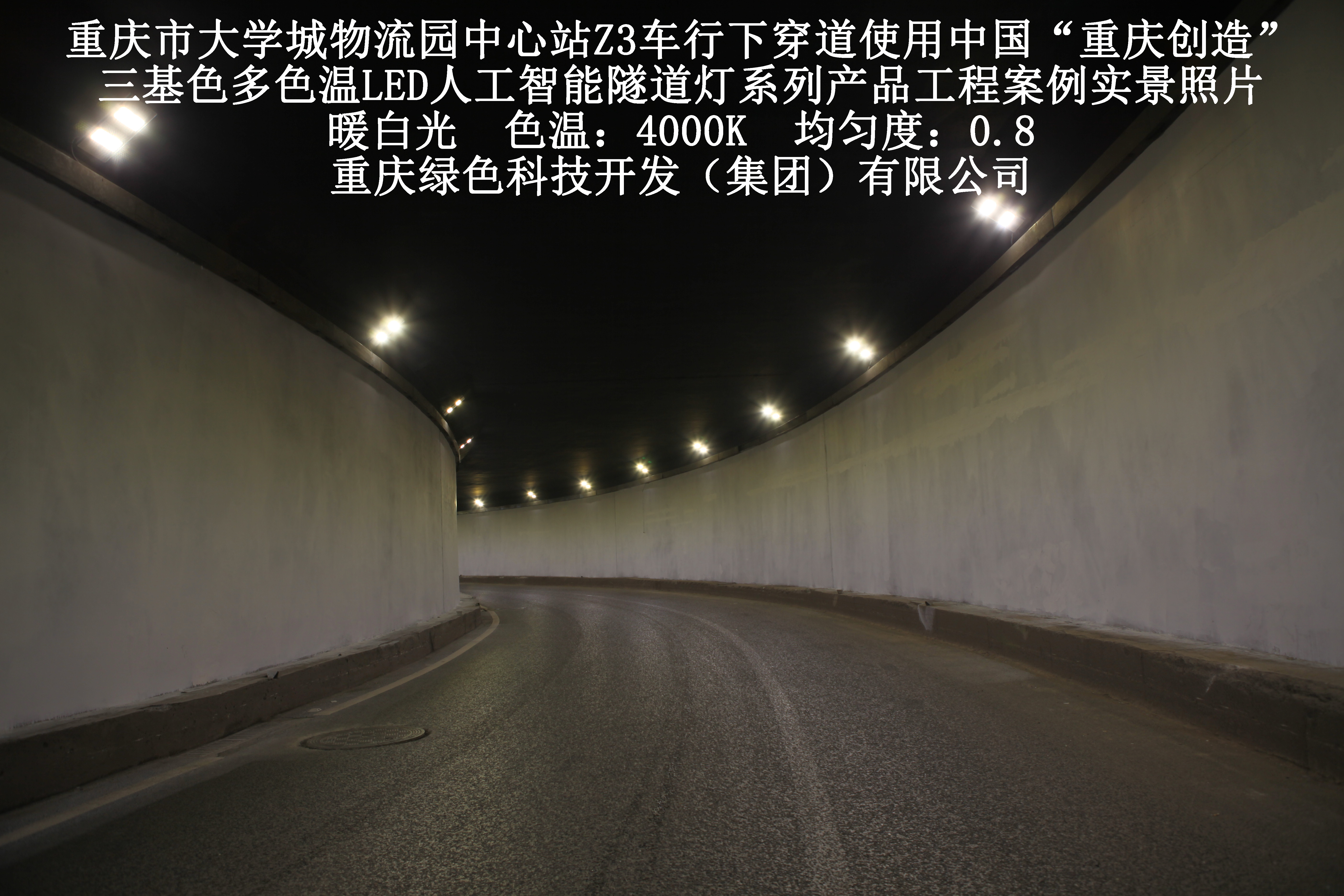2019年3月,重慶市大學(xué)城物流園中心站Z3車行下穿道使用我司自主研發(fā)制造的,重慶“中國創(chuàng)造”三基色多色溫LED人工智能隧道燈系列產(chǎn)品,實(shí)施了市政設(shè)施品質(zhì)提升工程(工程案例實(shí)景照片附后)。此項(xiàng)目的實(shí)施,極大地提高了隧道內(nèi)照明清晰度、燈光均勻度、舒適度及照明安全性,實(shí)現(xiàn)了隧道照明系統(tǒng)的智能化管理。